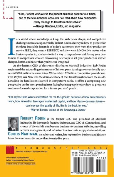 No matter what business you're in, odds are that customers will demand the same things of your product or service: they want it free, they want it perfect, and they want it now. In the meantime, your competitors are investigating ways to sell your product or service cheaper, better, or faster than you've ever imagined. As the CEO of electronics distributor Marshall Industries, and the disciple of management guru W.Edwards Deming, Robert Rodin was responsible for overseeing the creation of an award-winning business-to-business Web site far ahead of the competition and leading the company's radical reinvention into a wired, highly profitable 'high speed junction box.' FREE, PERFECT AND NOW is at once the story of that transformation, a practical guidebook, and a blueprint for tuning and coordinating every function of any organisation. For those eager to learn how to prepare a customer-focused organisation for an unpredictable future, Robert Rodin has innovative and thought-provoking answers.