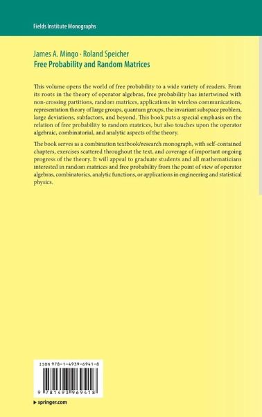 The book serves as a combination textbook/research monograph, with self-contained chapters, exercises scattered throughout the text, and coverage of important ongoing progress of the theory. It will appeal to graduate students and all mathematicians interested in random matrices and free probability from the point of view of operator algebras, combinatorics, analytic functions, or applications in engineering and statistical physics.