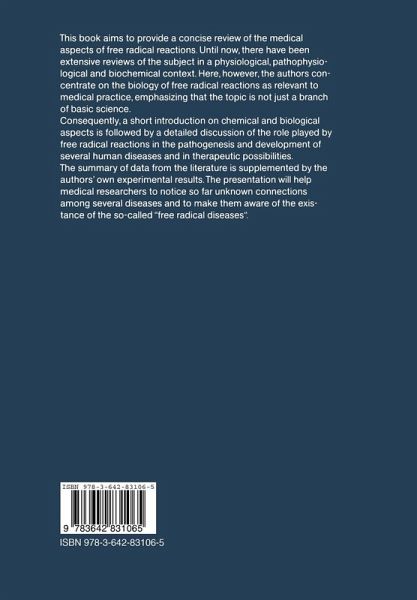 I The Chemistry of Free Radical Reactions.- 1 The Definition and Reactions of Free Radicals.- 2 Lipid Peroxidation.- 3 The Most Important Physical and Chemical Properties of Molecular Oxygen: Radicals of Molecular Oxygen.- 4 Reactions in which ROIs are Formed.- 5 Summary.- II Control of Free Radical Reactions in Biological Systems.- 1 Control by Membrane Structure.- 2 Control by Specific Molecular Structure.- 3 Scavengers and Antioxidants.- 4 Cellular Enzymatic Defence Against Radicals of Molecular Oxygen.- 5 Antioxidant Defence of the Extracellular Space.- 6 Summary.- III Physiological Free Radical Reactions.- 1 The Role of Free Radical Reactions in Phagocytosis.- 2 Free Radicals Generated During Platelet Activity.- 3 Free Radical Generation in Mitochondrial and Microsomal Electron Transport Chains and in Peroxisomes.- 4 Role of Free Radicals in the Synthesis and Degradation of Various Biomolecules: Free Radical Formation During Autoexidation of Biomolecules.- 5 The Role of Free Radicals in Reproduction and Embryonic Development.- 6 Summary.- IV Pathological Free Radical Reactions: General Aspects.- 1 Damage of Enzymes and Proteins Caused by Free Radicals.- 2 Damage of the Cell Membrane and Subcellular Organelles.- 3 Fluorescent Molecular Damage and Lipofuscin Pigments.- 4 Free Radical Damage of Nucleic Acids and Their Components.- 5 Connection Between LPO and Tissue Damage.- 6 Summary.- V Demonstration of Free Radical Reactions.- 1 Summary.- VI Clinical Importance of Free Radical Reactions and Their Role in the Pathogenesis of Various Human Diseases.- 1 The Radical Theory of Oxygen Toxicity.- 2 The Role of Free Radical Reactions in Inflammation.- 3 Relation of Free Radical Reactions to the Immune System and Their Role in Immunopathological Syndromes.- 4 The Free Radical Theory of Ageing.- 5 The Role of Free Radical Reactions in the Pathogenesis of Some Neurological Diseases.- 6 The Free Radical Pathogenesis of Atherosclerosis.- 7 Hypertension and Free Radical Reactions.- 8 Free Radical Reaction in Ischaemic Damage.- 9 Free Radical Reactions in Other, Nonischaemic Heart Diseases.- 10 The Role of Free Radical Reactions in Carcinogenesis: Connection Between Atherosclerosis, Ageing, Carcinogenesis and Mutagenesis.- 11 Free Radical Reactions and Mutagenesis.- 12 Free Radical Mechanisms in the Effect of Drugs and Chemicals.- 13 Free Radical Reactions in Pulmonary Diseases.- 14 Free Radical Reactions in Hepatic Diseases.- 15 Free Radical Reactions in Diseases of the Gastrointestinal Traet.- 16 Free Radical Pathogenesis of Amyloidosis.- 17 Diabetes Mellitus and Pathological Free Radical Reactions.- 18 Haematological Aspects.- 19 Free Radical Reactions in Neonatal Diseases.- 20 Free Radical Reactions in Infectious Diseases.- 21 Hormones and Free Radical Reactions.- 22 Ophthalmological Aspects.- 23 Free Radical Reactions in Muscular Dystrophy.- 24 Free Radical Reactions in Pyelonephritis, Uraemia and urological Diseases.- 25 Other Diseases: Down's Syndrome.- 26 The Role of Free Radical Reactions in Photobiology.- VII Defence Against Free Radical Reactions.- 1 Minimizing Exposure.- 2 Antioxidants.- 3 Summary.- Epilogue.- References.
