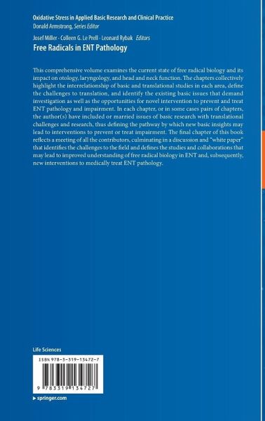 This comprehensive volume examines the current state of free radical biology and its impact on otology, laryngology, and head and neck function. The chapters collectively highlight the interrelationship of basic and translational studies in each area, define the challenges to translation, and identify the existing basic issues that demand investigation as well as the opportunities for novel intervention to prevent and treat ENT pathology and impairment. In each chapter, or in some cases pairs of chapters, the author(s) have included or married issues of basic research with translational challenges and research, thus defining the pathway by which new basic insights may lead to interventions to prevent or treat impairment. The final chapter of this book reflects a meeting of all the contributors, culminating in a discussion and "white paper" that identifies the challenges to the field and defines the studies and collaborations that may lead to improved understanding of free radical biology in ENT and, subsequently, new interventions to medically treat ENT pathology.