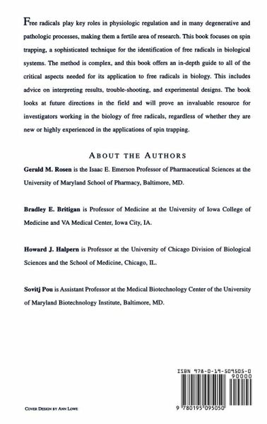 A handbook for biologists and biochemists on free radicals, emphasizing the techniques for analysing free radicals. Free radicals, atoms with at least one unpaired electron, the most abundant of which is molecular oxygen, are implicated in many degradative or damaging processes in cells, and also play important roles in physiologic regulation. Spinn trapping, the spectroscopic methods for studying free radicals, is subject to a range of difficulties, potential artifacts or errors of interpretation that make a practical, helpful, trouble-shooting guide a rather high priority for anyone working in the area, and there is presently no such book.