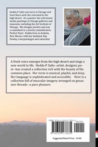 A fresh voice emerges from the high desert and sings a new world to life. Hedda P. Saltz--artist, designer, poet--has created a collection rich with the beauty of the common place. Her verse is musical, playful, and deep. Her language is sophisticated and accessible. Here is a collection full of muscular imagery arranged on gossamer threads-a pure pleasure.