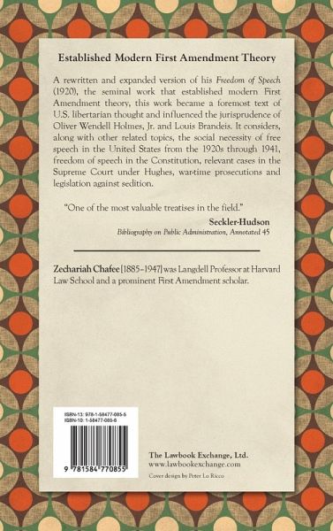 A rewritten and expanded version of his Freedom of Speech (1920), the seminal work that established modern First Amendment theory, this work became a foremost text of U.S. libertarian thought and influenced the jurisprudence of Oliver Wendell Holmes, Jr. and Louis Brandeis. It considers, along with other related topics, the social necessity of free speech in the United States from the 1920’s through 1941, freedom of speech in the Constitution, relevant cases in the Supreme Court under Hughes, war-time prosecutions, legislation against sedition. xviii, 634 pp.