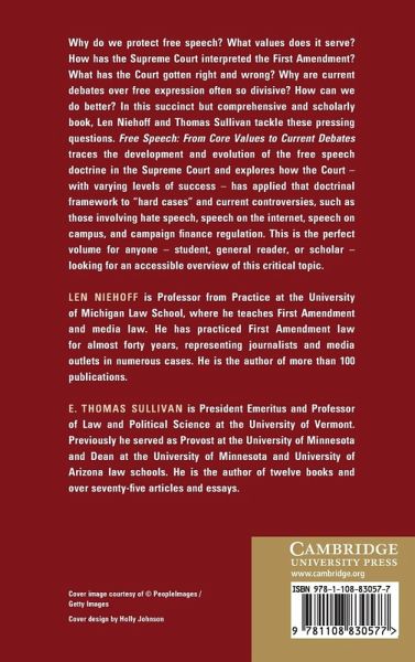 Why do we protect free speech? What values does it serve? How has the Supreme Court interpreted the First Amendment? What has the Court gotten right and wrong? Why are current debates over free expression often so divisive? How can we do better? In this succinct but comprehensive and scholarly book, authors Len Niehoff and Thomas Sullivan tackle these pressing questions. Free Speech: From Core Values to Current Debates traces the development and evolution of the free speech doctrine in the Supreme Court and explores how the Court - with varying levels of success - has applied that doctrinal framework to "hard cases" and current controversies, such as those involving hate speech, speech on the internet, speech on campus, and campaign finance regulation. This is the perfect volume for anyone - student, general reader, or scholar - looking for an accessible overview of this critical topic.