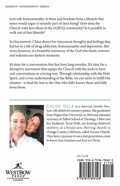Let's talk homosexuality. Is there real freedom from a lifestyle that some would argue is innately part of one's being? How does the Church truly love those in the LGBTQ community? Is it possible to walk out of that lifestyle? In this memoir, Chloe shares her innermost thoughts and feelings that led her to a life of drug addiction, homosexuality and depression. Her story, however, is a beautiful testimony of the God who heals, restores and redeems our darkest moments. It's time for a conversation that has been long overdue. It's time for a disruptive movement that equips the Church with the tools to have real conversations in a loving way. Through relationship with the Holy Spirit, and a true understanding of the Bible, we can unite to fulfill His mission - to lead the lost to the One who fully knows them and fully loves them.