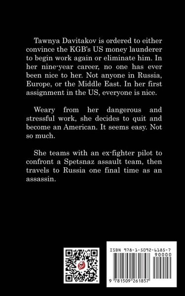Tawnya Davitakov is ordered to either convince the KGB's US money launderer to begin work again or eliminate him. In her nine-year career, no one has ever been nice to her. Not anyone in Russia, Europe, or the Middle East. In her first assignment in the US, everyone is nice. Weary from her dangerous and stressful work, she decides to quit and become an American. It seems easy. Not so much. She teams with an ex-fighter pilot to confront a Spetsnaz assault team, then travels to Russia one final time as an assassin.