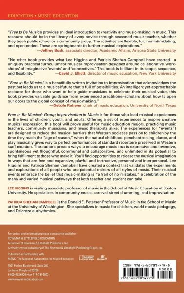 No other book provides what Higgins and Campbell have created-a uniquely practical curriculum for musical improvisation designed around collaborative 'workshops' of imaginative 'events' and 'connectives.' This book is brilliant in its scope, sequence, and flexibility. -- David J. Elliott, director of music education, New York University Free to be Musical provides an ideal introduction to creativity and music making. This resource should be in the library of every novice through seasoned music teacher, whether teaching public school or a community group. The activities are flexible, fun, non-intimidating and open ended; they would be a joy to share with others! Most teachers and musicians will see these as springboards to a myriad of further musical explorations. -- Dr. Jeffrey Bush, associate director, Academic Affairs, Arizona State University Free to Be Musical is a beautifully written invitation to improvisation that acknowledges the past but leads us to a musical future that is full of possibilities. An intelligent yet approachable resource for those who want to help guide musicians to celebrate their musical voice, this book provides valuable guidance from experienced practitioner-scholars about how to open our doors to the global concept of music making. -- Debbie Rohwer, PhD, Chair of Music Education, University of North Texas In the previous decade, music making received increased attention within schools of music, K-12 classrooms, and community music-making  endeavors. Often these experiences required participants to be able to translate musical notation into sound. This approach is limiting and often forecloses music-making experiences for those unable to read music. Free to Be Musical serves as a resource for educators who want to create inclusive and meaningful musical experiences for all. Higgins (Boston Univ.) and Campbell (Univ. of Washington) use the perspective of community music making and group improvisation. The book is structured in three parts. 'Orientation' introduces the foundations for music making and the terminology used throughout the text. 'Events' presents 21 musical experiences. Each event is aligned with National Standards for Music Education, and necessary materials and ideas for event extensions are provided. Finally, 'Connectives' provides ideas for the further development of the 21 events through curriculum, community music-making experiences, and music therapy. The emphasis on the making of music through events that are inclusive makes this text a welcome addition to the library of music teachers, music therapists, and organizers of community music-making experiences. Summing Up: Recommended. General readers, undergraduate students, and practitioners. CHOICE