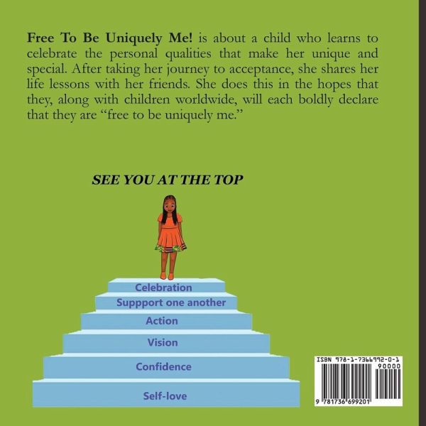 Free To Be Uniquely Me! is about a child who learns to celebrate the personal qualities that make her unique and special. After taking her journey to acceptance, she shares her life lessons with her friends. She does this in the hopes that they, along with children worldwide, will each boldly declare that they are "free to be uniquely me." This book is ideal for social-emotional lessons as well as teaching children the importance of loving themselves, and treating others with love and respect.