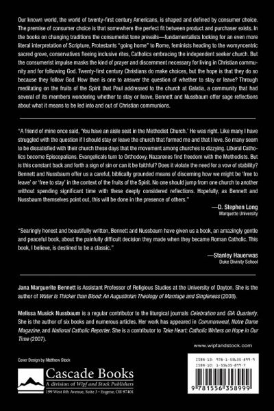 Our known world, the world of twenty-first century Americans, is shaped and defined by consumer choice. The premise of consumer choice is that somewhere the perfect fit between product and purchaser exists. In the books on changing traditions the consumerist tone prevails--fundamentalists looking for an even more literal interpretation of Scripture, Protestants "going home" to Rome, feminists heading to the womyncentric sacred grove, conservatives fleeing inclusive rites, Catholics embracing the independent seeker church. But the consumerist impulse masks the kind of prayer and discernment necessary for living in Christian community and for following God. Twenty-first century Christians do make choices, but the hope is that they do so because they follow God. How then is one to answer the question of whether to stay or leave? Through meditating on the fruits of the Spirit that Paul addressed to the church at Galatia, a community that had several of its members wondering whether to stay or leave, Bennett and Nussbaum offer sage reflections about what it means to be led into and out of Christian communions.