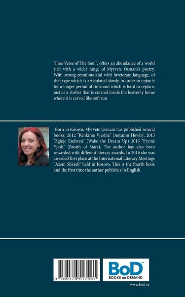 "Free Verse of The Soul", offers an abundance of a world rich with a wider range of Myrvete Osmani's poetry. With strong emotions and with inveterate language, of that type which is articulated slowly in order to enjoy it for a longer period of time and which is hard to replace, just as a shelter that is created inside the heavenly home where it is carved like soft sun.
