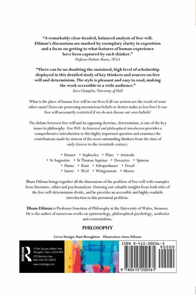 What is the place of human free will in our lives if all our actions are the result of some other cause? Does our processing unconscious beliefs or desires make us less free? Is our free will necessarily restricted if we do not choose our own beliefs? The debate between free will and its opposing doctrine, determinism, is one of the key issues in philosophy. Free Will: An historical and philosophical introduction provides a comprehensive introduction to this highly important question and examines the contributions made by sixteen of the most outstanding thinkers from the time of early Greece to the twentieth century: *Homer *Sophocles *Platto *Aristotle *St Augustine *St Thomas Aquinas *Descaartes *Spinoza *Hume *Kant *Schopehauer *Freud *Sartre *Weil *Wittgenstein *Moore Ilham Dilman brings together all the dimensions of the problem of free will with examples from literature, ethics and psychoanalysis. Drawing out valuable insights from both sides of the free will-determinism divide, and he provides an accessible and highly readable introduction to this perennial problem.