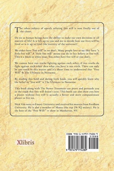 The taboo subject of openly refuting free will is now finally out of the closet. Do we as human beings have the ability to make our own decisions in all matters of life? Is it left up to you and me to decide how our lives will be lived or is it up to God (the entirety of the universe)? We either have "free will" or we don't. Many people love to say they have "a little free will." A "little free will" means you do in fact believe in free will. This is a black or white issue. You either have free will or you don't. We cannot have two truths fighting against each other; if two truths do fight against each other then what you have is not truth. There can only be one truth in this matter and it's about time to understand that "Free Will" Is The Ultimate in Nonsense. By reading this bold and daring little book, you will quickly learn why the belief in "free will" is The Ultimate in Nonsense. This book along with The Newer Testament can prove and persuade you to the truth that free will doesn't exist. This book can also show you how a planet without free will is actually a better and more compassionate planet to live on. Enel Vale went to Emory University and received his masters from Fordham University. He is also a member of Mensa (the top 2% IQ society). He is the host of the "No Free Will" tv show in Manhattan, NY.