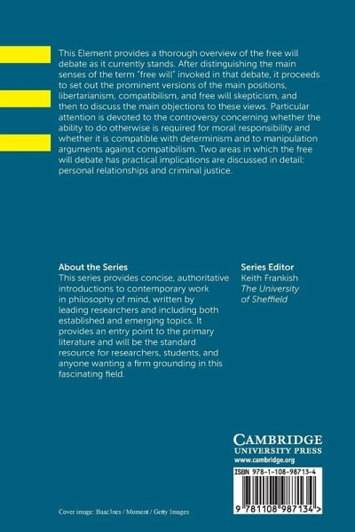 This Element provides a thorough overview of the free will debate as it currently stands. After distinguishing the main senses of the term 'free will' invoked in that debate, it sets out the prominent versions of the main positions, libertarianism, compatibilism, and free will skepticism, and then discuss the main objections to these views.