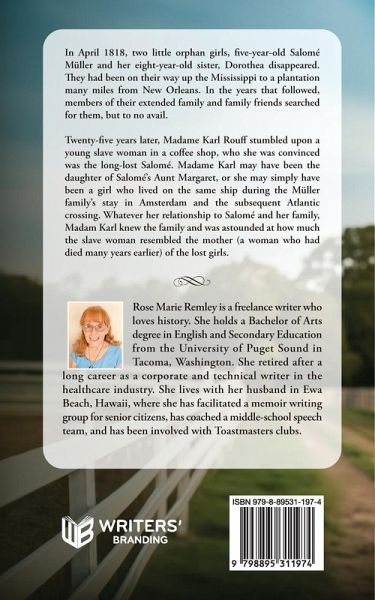 Synopsis: In April 1818, two little orphan girls, five-year-old Salomé Müller and her eight-year-old sister, Dorothea disappeared. They had been on their way up the Mississippi to a plantation many miles from New Orleans. In the years that followed, members of their extended family and family friends searched for them, but to no avail. Twenty-five years later, Madame Karl Rouff stumbled upon a young slave woman in a coffee shop, who she was convinced was the long-lost Salomé. Madame Karl may have been the daughter of Salomé's Aunt Margaret, or she may simply have been a girl who lived on the same ship during the Müller family's stay in Amsterdam and the subsequent Atlantic crossing. Whatever her relationship to Salomé and her family, Madam Karl knew the family and was astounded at how much the slave woman resembled the mother (a woman who had died many years earlier) of the lost girls. Autobiography: Rose Suemoto is a freelance writer who loves history. She holds a Bachelor of Arts degree in English and Secondary Education from the University of Puget Sound in Tacoma, Washington. She retired after a long career as a corporate and technical writer in the healthcare industry. She lives with her husband in Ewa Beach, Hawaii, where she has facilitated a memoir writing group for senior citizens, has coached a middle-school speech team, and has been involved with Toastmasters clubs.