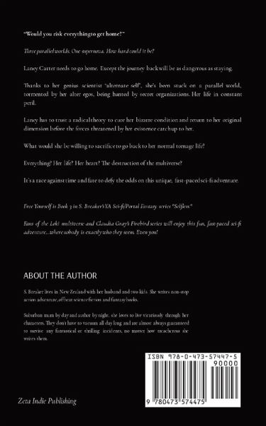 "Would you risk everything to get home?" Three parallel worlds. One supernova. How hard could it be? Laney Carter needs to go home. Except the journey back will be as dangerous as staying. Thanks to her genius scientist "alternate self", she's been stuck on a parallel world, tormented by her alter egos, being hunted by secret organizations. Her life in constant peril. Laney has to trust a radical theory to cure her bizarre condition and return to her original dimension before the forces threatened by her existence catch up to her. What would she be willing to sacrifice to go back to her normal teenage life? Everything? Her life? Her heart? The destruction of the multiverse? It's a race against time and fate to defy the odds on this unique, fast-paced sci-fi adventure. Free Yourself is Book 3 in S. Breaker's YA Portal Fantasy Sci-fi series "Selfless". Offbeat, quirky, easy reading science fiction and fantasy. Check out other books by S. Breaker.