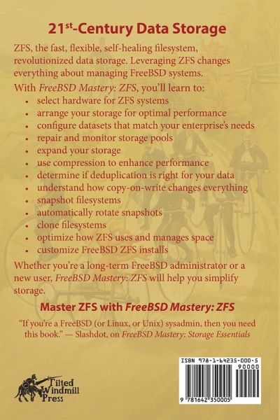 21st-Century Data Storage ZFS, the fast, flexible, self-healing filesystem, revolutionized data storage. Leveraging ZFS changes everything about managing FreeBSD systems. With FreeBSD Mastery: ZFS, you’ll learn to: understand how your hardware affects ZFS arrange your storage for optimal performance configure datasets that match your enterprise’s needs repair and monitor storage pools expand your storage use compression to enhance performance determine if deduplication is right for your data understand how copy-on-write changes everything snapshot filesystems automatically rotate snapshots clone filesystems understand how ZFS uses and manages space do custom FreeBSD ZFS installs Whether you’re a long-term FreeBSD administrator or a new user, FreeBSD Mastery: ZFS will help you simplify storage. Master ZFS with FreeBSD Mastery: ZFS.