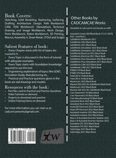 The FreeCAD 0.20 Black Book (Colored) is the 3rd edition of our series on FreeCAD. This book is written to help beginners in creating some of the most complex solid models. The book follows a step by step methodology. In this book, we have tried to give real-world examples with real challenges in designing. We have tried to cover most of the topics utilized in industries for designing. The book covers almost all the information required by a learner to master the FreeCAD. The book starts with sketching and ends at advanced topics like Path (CAM), and FEM (Simulation). In this edition, we have added tools of addon workbenches like Sheet Metal, CFDOf, Assembly4, and so no. Some of the salient features of this book are : In-Depth explanation of concepts Every new topic of this book starts with the explanation of the basic concepts. In this way, the user becomes capable of relating the things with real world. Topics Covered Every chapter starts with a list of topics being covered in that chapter. In this way, the user can easily find the topics of his/her interest easily. Instruction through illustration The instructions to perform any action are provided by maximum number of illustrations so that the user can perform the actions discussed in the book easily and effectively. There are about 2012 illustrations that make the learning process effective. Tutorial point of view At the end of concept's explanation, the tutorial make the understanding of users firm and long lasting. Almost each chapter of the book has tutorials that are real world projects. Moreover most of the tools in this book are discussed in the form of tutorials. Project Projects and exercises are provided to students for practicing. For Faculty If you are a faculty member, then you can ask for video tutorials on any of the topic, exercise, tutorial, or concept. As faculty, you can register on our website to get electronic desk copies of our latest books. Faculty resources are available in the Faculty Member page of our website once you login. Note that faculty registration approval is manual and it may take two days for approval before you can access the faculty website.