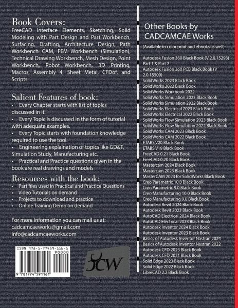 The FreeCAD 0.21 Black Book is the new, updated 4th edition of our series on FreeCAD. This book is written to help beginners in creating some of the most complex solid models. The book follows a step-by-step methodology. In this book, we have tried to give real-world examples with real challenges in designing. We have tried to cover most of the topics utilized in industries for designing. The book covers almost all the information required by a learner to master the FreeCAD. The book starts with sketching and ends at advanced topics like Path (CAM), FEM (Simulation), Sheet Metal, CFDOf, Assembly4, and so on. Some of the salient features of this book are: In-Depth explanation of concepts Every new topic of this book starts with the explanation of the basic concepts. In this way, the user becomes capable of relating the things with real world. Topics Covered Every chapter starts with a list of topics being covered in that chapter. In this way, the user can easily find the topics of his/her interest easily. Instruction through illustration The instructions to perform any action are provided by maximum number of illustrations so that the user can perform the actions discussed in the book easily and effectively. There are about 2000 illustrations that make the learning process effective. Tutorial point of view At the end of concept's explanation, the tutorial makes the understanding of users firm and long lasting. Almost each chapter of the book has tutorials that are real world projects. Moreover, most of the tools in this book are discussed in the form of tutorials. Project Projects and exercises are provided to students for practicing.