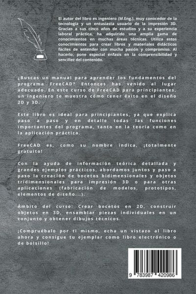 ¿Buscas un manual para aprender los fundamentos del programa FreeCAD? Entonces has venido al lugar adecuado. En este curso de FreeCAD para principiantes, un ingeniero te muestra cómo tener éxito en el diseño 2D y 3D. Este libro es ideal para principiantes, ya que explica paso a paso y en detalle todas las funciones importantes del programa, tanto en la teoría como en la aplicación práctica. FreeCAD es, como su nombre indica, ¡totalmente gratuito! Este libro es para cualquiera que quiera aprender diseño CAD de un ingeniero (M.Eng.). Con la ayuda de información teórica detallada y grandes ejemplos prácticos, abordamos juntos y paso a paso la creación de bocetos bidimensionales y objetos tridimensionales para impresión 3D o para otras aplicaciones (fabricación de modelos, prototipos, elementos de diseño...). ¡Compruébalo por ti mismo, echa un vistazo al libro y consigue tu ejemplar en edición de bolsillo o ebook! Más de 200 ilustraciones en color apoyan las explicaciones del libro y crean así una introducción clara y fácil a la construcción, el montaje de piezas individuales y la creación de dibujos técnicos. FreeCAD es un programa muy completo que puede parecer extremadamente complejo sin instrucciones. No sólo puedes construir objetos 3D con FreeCAD, sino también crear ensamblajes, derivar dibujos técnicos y ¡mucho más! Examinaremos todo esto en detalle. ¡Este práctico libro contiene todo lo que necesitas saber como principiante para utilizar el software FreeCAD! Las ventajas de este libro de un vistazo: - Obtén explicaciones básicas paso a paso sobre cómo utilizar FreeCAD bajo la guía de un ingeniero (Máster en Ingeniería) - Aprendizaje práctico con la ayuda de grandes proyectos de ejemplo - Ámbito del curso: Crear bocetos en 2D, construir objetos en 3D, ensamblar piezas individuales en un conjunto y generar dibujos técnicos - Una introducción sencilla, sin complicaciones y rápida a FreeCAD - Explicaciones de la materia fáciles de seguir. Ideal para principiantes y novatos absolutos. Apto para todas las edades y conocimientos previos. Adecuado para alumnos, estudiantes, empleados, manitas e inventores, jubilados ... - Aprende todo lo importante rápidamente. Compacto y directo - número de páginas: aprox. 160 páginas ¡Echa un vistazo al libro y consigue tu ejemplar en edición de bolsillo o ebook!