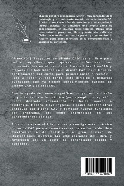 FreeCAD está disponible de forma totalmente gratuita. Nota importante: Este curso presupone conocimientos básicos de FreeCAD. Como principiante, asegúrese de obtener previamente el curso para principiantes: "FreeCAD - Paso a Paso". "FreeCAD - Proyectos de diseño CAD" es el libro para todos aquellos que quieran profundizar sus conocimientos en el uso del software libre FreeCAD y mejorar sus habilidades en el diseño CAD. Es el libro de continuación del curso para principiantes "FreeCAD Paso a Paso" y, por tanto, está dirigido a usuarios avanzados que ya tienen conocimientos básicos de diseño CAD y de FreeCAD. Con la ayuda de nueve magníficos proyectos de diseño muy orientados a la práctica (por ejemplo, mosquetón, rueda dentada, rodamiento de bolas, mando a distancia, florero, llave inglesa...) podrá conocer otros enfoques del diseño CAD y también nuevas funciones del programa, así como profundizar en sus conocimientos básicos. Eche un vistazo al libro ahora y consiga este práctico curso de CAD para alumnos avanzados en forma de libro electrónico o de bolsillo. Un gran número de ilustraciones ilustran las explicaciones del libro y favorecen así un éxito de aprendizaje rápido y duradero. Las ventajas de este libro de un vistazo: - Explicaciones paso a paso del diseño CAD y del uso de FreeCAD a través de la guía de un ingeniero (Master en Ingeniería) - Aprendizaje práctico con la ayuda de proyectos. Cada paso se explica con detalle y claridad - Profundizar en los comandos básicos de FreeCAD - Conozca nuevas funciones 2D y 3D - Nuevos enfoques del diseño CAD - Implemente proyectos de diseño interesantes: Muelle helicoidal, mosquetón, rueda dentada, florero, llave, pistón incl. biela y bulón, cojinete de bolas, regadera, mando a distancia... ¡ECHE UN VISTAZO AL LIBRO AHORA MISMO Y PIDA UN EJEMPLAR! SI ES USTED PRINCIPIANTE, ASEGÚRESE ANTES DE ADQUIRIR EL CURSO PARA PRINCIPIANTES: "FREECAD PASO A PASO".