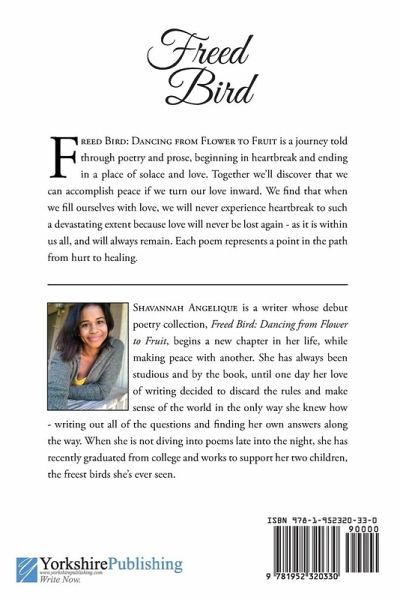 Freed Bird: Dancing from Flower to Fruit is a journey told through poetry and prose, beginning in heartbreak and ending in a place of solace and love. Together we'll discover that we can accomplish peace if we turn our love inward. We find that when we fill ourselves with love, we will never experience heartbreak to such a devastating extent because love will never be lost again - as it is within us all, and will always remain. Each poem represents a point in the path from hurt to healing.
