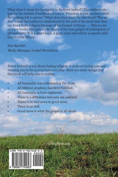 What does it mean for humanity to be freed indeed? The author's slogan for his website FreedIndeed.com is "Freedom is just another word for nothing left to prove." What does that mean for this book? The author wants his readers to understand by the end of the book that they are freed from religion because of the Gospel of Grace. The author wrote, "the good part about the gospel is that it was applied to all humanity at the cross." This is good news because it includes all people, rather than just a select few who know about God. God's grace is given; God's grace is not asked for. God's grace was never a bargain to be struck or a transaction to be conducted. Grace was a free gift imputed to all humanity at the same time. Nevertheless, religion capitalizes on grace by using it as a carrot. The very word "Religion" is derived from the Latin meaning "to bind up again," or "to rebind," and pretty well speaks for itself. In fact, religion assigns a list of disciplines its people must do to be good disciples. Pulpits preach that religion makes people free, but they place burden after burden on those people, starting with "You must believe" and ending with "you must behave." When people realize they are not free because of those burdens, they start seeking other ways to get freed. God and man are commingled together as one identity because of Jesus Christ and the cross. That means that no one can tell where God begins and where man ends. Of course, none of this would be possible if sin did not die on the cross with Jesus. Jesus became sin before dying and then died, which killed sin forever. Thankfully, because of Jesus's work on the cross, sin no longer exists between man and God. However, people still do evil acts to each other, which is why humanity has civil laws and prisons. Nevertheless, the wrong that people do against each other is not the same as sinning against God, which is non-existent after the cross. All humanity was redeemed at the cross, and, today, because of the cross, all people are born righteous in God's eyes and are commingled with God. This is one of a few books that gets to the heart of the true gospel of redemption of all humanity. It is a short book, a great read and will be a superb addition to your library. In conclusion, the good part about the gospel is that it applied to all humanity at the cross. People may not know about it, but that does not mean that it is not there within them. When people realize that they are redeemed regardless of what they have done, it is an "ah ha!" moment. It is a refreshing moment. It is an exciting moment. When I realized that I was righteous and had been since I was born, it was so exciting to me that I was as giddy as a little schoolchild. I still feel giddy as a schoolchild, and so much so that I want to tell as many people as I can about it. Beginning with you. By Don Bartlett Media Manager, Gospel Revolution