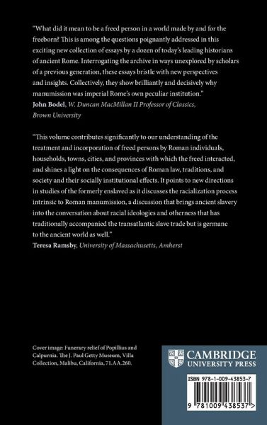 Introduction - Freed persons in the Roman world: status, diversity, and representation Sinclair W. Bell, Dorian Borbonus, and Rose Maclean; 1. Permissu decurionum: freed persons and burial management in the collective tomb of the Volusii Dorian Borbonus; 2. Freed public slaves in Roman Italy and the western provinces: legal status and social integration Franco Luciani; 3. Fitting in by decree: freed slaves, euergetism, and local politics Marc Kleijwegt; 4. Doubling up: patronal and familial designations on epitaphs Katharine Huemoeller; 5. The cost of ingratitude:freed persons, patrons, and re-enslavement Nicole Giannella; 6. Between moral slavery and legal freedom: freed people and aristocratic behavior in Neronian literature Fábio Duarte Joly; 7. Framing the freed person: (de)contextualizing the representation of freed peoples' voices in the literary record Kristof Vermote; 8. Novel evidence for ancient freed people: Xenophon of Ephesus' Ephesiaca and the Cena trimalchionis William M. Owens; 9. The affects of manumission: racial melancholy and Roman freed persons Dan-El Padilla Peralta.