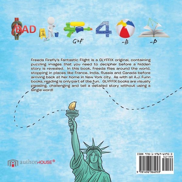 Freeda Firefly's Fantastic Flight is a GLYFFIX original, containing puzzling images that you need to decipher before a hidden story is revealed. In this book, Freeda flies around the world, stopping in places like France, India, Russia and Canada before arriving back at her home in New York city. As with all A.J. Funn books, reading is only part of the fun. GLYFFIX books are visually pleasing, challenging and tell a detailed story without using a single word!