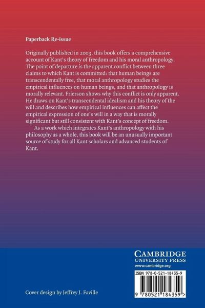 This book offers a comprehensive account of Kant's theory of freedom and his moral anthropology. The point of departure is the apparent conflict between three claims to which Kant is committed: that human beings are transcendentally free, that moral anthropology studies the empirical influences on human beings, and that more anthropology is morally relevant. Frierson shows why this conflict is only apparent. He draws on Kant's transcendental idealism and his theory of the will and describes how empirical influences can affect the empirical expression of one's will in a way that is morally significant but still consistent with Kant's concept of freedom. As a work which integrates Kant's anthropology with his philosophy as a whole, this book will be an unusually important source of study for all Kant scholars and advanced students of Kant.