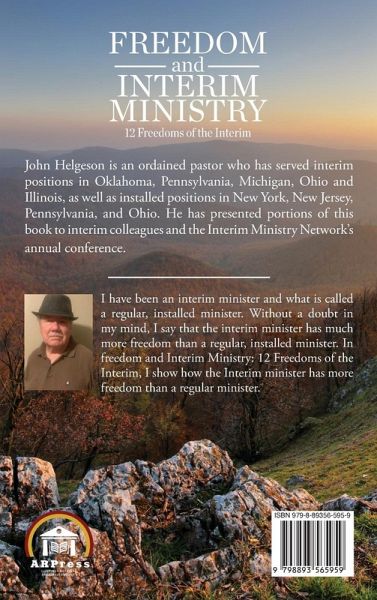 John Helgeson is an ordained pastor who has served interim positions in Oklahoma, Pennsylvania, Michigan, Ohio and Illinois, as well as installed positions in New York, New Jersey, Pennsylvania, and Ohio. He has presented portions of this book to interim colleagues and the Interim Ministry Network's annual conference. I have been an interim minister and what is called a regular, installed minister. Without a doubt in my mind, I say that the interim minister has much more freedom than a regular, installed minister. In freedom and Interim Ministry: 12 Freedoms of the Interim, I show how the Interim minister has more freedom than a regular minister.
