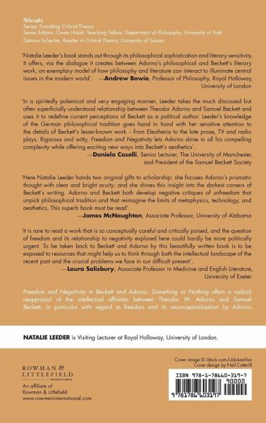 Since his notorious 1961 lecture, 'Trying to Understand Endgame', Theodor W. Adorno's name has been frequently coupled with that of Samuel Beckett. This book offers a radical reappraisal of the intellectual affinities between these two figures, whose paths crossed all too fleetingly. Specifically the book argues for a preoccupation with the concept of freedom in Beckett's works - one which situates him as a profoundly radical and even political writer. Adorno's own more explicit reconceptualization of freedom and its scarcity in modernity offers a unique lens through which to examine the way Beckett's works preserve a minimal space of freedom that acts in opposition to an unfree social totality. While acknowledging both the biographical encounters between Adorno and Beckett and the influence Beckett's writings had on Adorno's aesthetics, Natalie Leeder goes further to establish a dialogue between their intellectual positions, working with a range of texts from both writers and seeking insight in Adorno's less familiar works, as well as his magnum opera, Aesthetic Theory and Negative Dialectics.