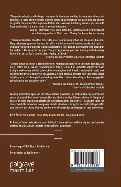 "The public schools are the largest monopoly in the nation, and they have not served our children well. Is there another sphere in which choice and competition has been a matter of such misguided contention? This superb collection of essays asks that timely and vital question with force and clarity. It's a must-read for serious educators." - Abigail Thernstrom, Vice-chair, U.S. Commission on Civil Rights, Adjunct Scholar, American Enterprise Institute