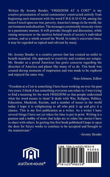 FREEDOM Without It What Are We? WITH IT WHO ARE WE? This Collection of Work was Done in the months following the Unlawful U.S. Invasion of a Sovereign Country, Iraq. Written By Jeremy Bender, "FREEDOM AT A COST" is my creative presentation of social commentary constructed entirely from beginning each statement with the word F-R-E-E-D-O-M, among the issues i touch upon are war, poverty, America's image in the world, the enviroment and education. the messages consistantly stress my views in a passionate manner. It will provoke thought and discussion, while raising awareness to the motives behind much of societies individual actions, and as a whole around the World.In todays uncertain times, it may be regarded as topical and relevent by many