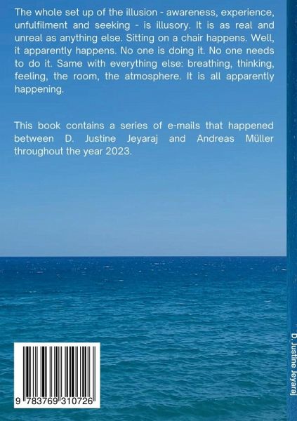 The whole set up of the illusion - awareness, experience, unfulfilment and seeking - is illusory. It is as real and unreal as anything else. Sitting on a chair happens. Well, it apparently happens. No one is doing it. No one needs to do it. Same with everything else: breathing, thinking, feeling, the room, the atmosphere. It is all apparently happening.  This book contains a series of e-mails that happened between D. Justine Jeyaraj and Andreas Müller throughout the year 2023.