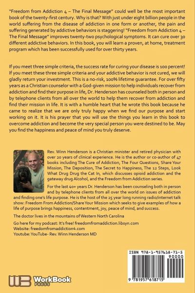 "Freedom from Addiction 4 - The Final Message" could well be the most important book of the twenty-first century. Why is that? With just under eight billion people in the world suffering from the disease of addiction in one form or another, the pain and suffering generated by addictive behaviors is staggering! "Freedom from Addiction 4 - The Final Message" improves twenty-two psychological symptoms. It can cure over 30 different addictive behaviors. In this book, you will learn a proven, at home, treatment program which has been successfully used for over thirty years.