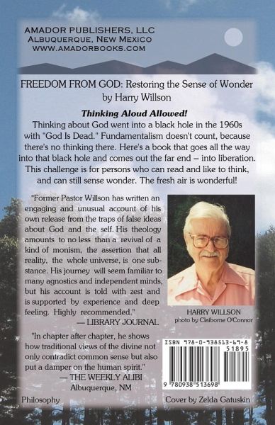 Thinking Aloud Allowed! Thinking about God went into a black hole in the '60s with "God Is Dead." Fundamentalism doesn't count, because there's no thinking there. Here's a book that goes all the way into that black hole and comes out the far end -- into liberation. This challenge is for persons who can read and like to think, and can still sense wonder. The fresh air is wonderful! A study in candor, a philosophical broadside of profound importance, a guide to personal liberation, an invitation to wonder - a book that links truth-seekers and truth-tellers. "Freedom From God" is the product of a lifetime of thinking and reading. For eight years Willson was a card-carrying "Master of Divinity," serving as missionary/pastor in New Mexico. Then he left the church in sorrow and anger over its failure to speak out against the Vietnam War. He taught high school for ten years, then quit teaching "to write," and entered what he came to call "the real world," thinking all the while. Eventually Willson decided that the word "God" was too contaminated to be useful, but found he experienced wonder, more than ever.