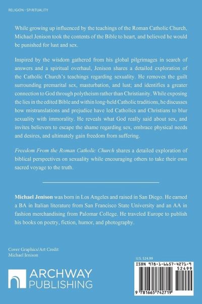 While growing up influenced by the teachings of the Roman Catholic Church, Michael Jenison took the contents of the Bible to heart, and believed he would be punished for lust and sex. Inspired by the wisdom gathered from his global pilgrimages in search of answers and a spiritual overhaul, Jenison shares a detailed exploration of the Catholic Church's teachings regarding sexuality. He removes the guilt surrounding premarital sex, masturbation, and lust; and identifies a greater connection to God through polytheism rather than Christianity. While exposing the lies in the edited Bible and within long-held Catholic traditions, he discusses how mistranslations and prejudice have led Catholics and Christians to blur sexuality with immorality. He reveals what God really said about sex, and invites believers to escape the shame regarding sex, embrace physical needs and desires, and ultimately gain freedom from suffering. Freedom From the Roman Catholic Church shares a detailed exploration of biblical perspectives on sexuality while encouraging others to take their own sacred voyage to the truth.