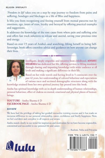 'Freedom in life' takes you on a step by step journey to freedom from pains and suffering, bondages and blockages to a life of Bliss and happiness. It lifts you from recognising and freeing yourself from mental patterns run by emotions, ego, issues of trust, loyalty and betrayal by offering practical examples and suggestions. It addresses the knowledge of the root cause from where pain and suffering arise and offers fast track solutions to release and ascend, saving your precious time and energy. Based on over 15 years of Anshu's soul searching, lifting herself to being Self-Sovereign, book offers countless advice and guidance on how anyone can change their lives.