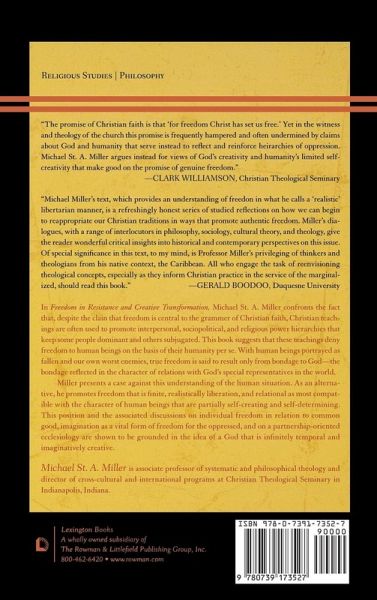 In Freedom in Resistance and Creative Transformation, Michael Miller addresses the concept of freedom that is central to the grammar of Christian faith and important in a wide range of religious and nonreligious settings across the globe. He confronts the fact that despite the claimed importance of freedom there continues to be interpersonal, socio-political, and religious power hierarchies that keep some people dominant and others subjugated. The book suggests that often these hierarchies are informed by Christian teachings that deny freedom to human beings on the basis of their humanity per se. Having classified humanity as fallen, we are instructed that freedom is experienced by disparaging our humanity as we actually experience it, seeing ourselves as our own worst enemies and accepting bondage to God-the bondage reflected in the character of relations with those seen as God's special representatives in the world. Miller presents a case against this understanding of the human situation, and in the process he critically engages the Old and New Testaments along with ideas of significant representatives of Christian orthodoxy. As an alternative he promotes freedom that is finite, realistically libertarian, and relational as most compatible with the character of human beings that are partially self-creating and self-determining. Contributing to this position is the view that an infinitely temporal God, by character and desire, participates in human life in a way that ensures the requisite space for authentic decision making, from which emerges genuinely novel possibilities for human life. This dynamic has implications for the continued development of the human species and the quality of life in the cosmos as a whole.