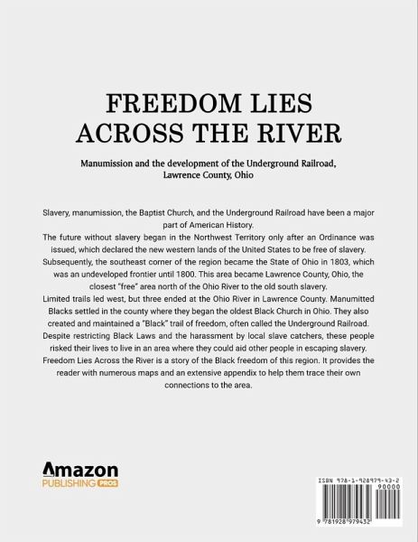 Slavery, manumission, the Baptist Church, and the Underground Railroad have been a major part of American History. The future without slavery began in the Northwest Territory only after an Ordinance was issued, which declared the new western lands of the United States to be free of slavery. Subsequently, the southeast corner of the region became the State of Ohio in 1803, which was an undeveloped frontier until 1800. This area became Lawrence County, Ohio, the closest "free" area north of the Ohio River to the old south slavery. Limited trails led west, but three ended at the Ohio River in Lawrence County. Manumitted Blacks settled in the county where they began the oldest Black Church in Ohio. They also created and maintained a "Black" trail of freedom, often called the Underground Railroad. Despite restricting Black Laws and the harassment by local slave catchers, these people risked their lives to live in an area where they could aid other people in escaping slavery. Freedom Lies Across the River is a story of the Black freedom of this region. It provides the reader with numerous maps and an extensive appendix to help them trace their own connections to the area.