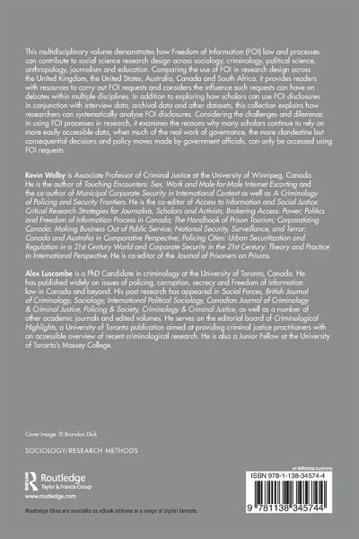 Kevin Walby is Associate Professor of Criminal Justice at the University of Winnipeg, Canada. He is the author of Touching Encounters: Sex, Work and Male-for-Male Internet Escorting and the co-author of Municipal Corporate Security in International Context as well as A Criminology of Policing and Security Frontiers. He is the co-editor of Access to Information and Social Justice: Critical Research Strategies for Journalists, Scholars and Activists; Brokering Access: Power, Politics and Freedom of Information Process in Canada; The Handbook of Prison Tourism; Corporatizing Canada: Making Business Out of Public Service; National Security, Surveillance, and Terror: Canada and Australia in Comparative Perspective; Policing Cities: Urban Securitization and Regulation in a 21st Century World and Corporate Security in the 21st Century: Theory and Practice in International Perspective. He is co-editor of the Journal of Prisoners on Prisons. Alex Luscombe is a PhD Candidate in criminology at the University of Toronto, Canada. He has published widely on issues of policing, corruption, secrecy and Freedom of Information law in Canada and beyond. His past research has appeared in Social Forces, British Journal of Criminology, Sociology, International Political Sociology, Canadian Journal of Criminology & Criminal Justice, Policing & Society, Criminology & Criminal Justice, as well as a number of other academic journals and edited volumes. He serves on the editorial board of Criminological Highlights, a University of Toronto publication aimed at providing criminal justice practitioners with an accessible overview of recent criminological research. He is also a Junior Fellow at the University of Toronto's Massey College.