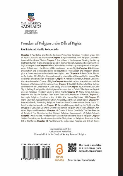 'The Australian Constitution contains no guarantee of freedom of religion or freedom of conscience. Indeed, it contains very few provisions dealing with rights - in essence, it is a Constitution that confines itself mainly to prescribing a framework for federal government, setting out the various powers of government and limiting them as between federal and state governments and the three branches of government without attempting to define the rights of citizens except in minor respects. […] Whether Australia should have a national bill of rights has been a controversial issue for quite some time. This is despite the fact that Australia has acceded to the ICCPR, as well as the First Optional Protocol to the ICCPR, thereby accepting an international obligation to bring Australian law into line with the ICCPR, an obligation that Australia has not discharged. Australia is the only country in the Western world without a national bill of rights. The chapters that follow in this book debate the situation in Australia and in various other Western jurisdictions.'