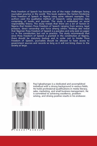 Press Freedom of Speech has become one of the major challenges facing Journalism practice in the world. This book explores the factors hindering Press Freedom of Speech in Nigeria using some relevant examples. The authors used the qualitative method of research; using secondary data comprising of books and journals. The study is embedded on social responsibility theory. The study reveals that there are a lot of factors in Nigeria that hinders Press Freedom of Speech ranging from secrecy, legal pressure, direct censorship and force among others. Findings also reveal that Nigerian Press Freedom of Speech is a paradox and only exist on paper i.e. in the constitution but not in practice. The study recommends that since Press Freedom of Speech is granted in the constitution of Nigeria, there should be statutory backup and in order not to hinder Press Freedom of Speech, journalists should be allowed to have access to government sources and records so long as it will not bring chaos to the society at large.
