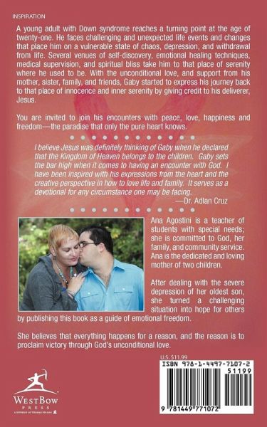 A young adult with Down syndrome reaches a turning point at the age of twenty-one. He faces challenging and unexpected life events and changes that place him on a vulnerable state of chaos, depression, and withdrawal from life. Several venues of self-discovery, emotional healing techniques, medical supervision, and spiritual bliss take him to that place of serenity where he used to be. With the unconditional love, and support from his mother, sister, family, and friends, Gaby started to express his journey back to that place of innocence and inner serenity by giving credit to his deliverer, Jesus.