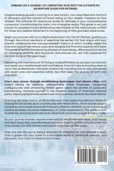 Embark on a Journey of Liberation: Dive into the Ultimate RV Adventure Guide for Retirees Imagine waking up every morning to a new horizon, your days filled with the thrill of discovery and the comfort of home rolling on four wheels. Freedom on Four Wheels: The Ultimate RV Adventure Guide for Retirees is your comprehensive companion, transforming this vision into a tangible reality. This guide is not just a book; it's a passport to an exhilarating new chapter of life, meticulously crafted for those who believe retirement is the beginning of life's grandest adventures. Begin your journey with an in-depth exploration into the RV lifestyle, guiding you through the critical decisions of selecting the perfect RV that aligns with your dreams. Understand the nuances between Class A, B, and C models, weigh the pros and cons of new versus used, and navigate the financial aspects with ease. This guide simplifies the daunting process of downsizing, offers practical advice on managing domicile and insurance, and ensures you are fully prepared for full-time living on the open road. Mastering the mechanics of RV living is made effortless as you learn to maintain and repair your mobile haven with confidence. From DIY tips to knowing when to call in the professionals, this book covers it all, including how to stay connected with loved ones and essential safety tips that keep the journey smooth and enjoyable. Chart your course through breathtaking landscapes and vibrant cities, with expert advice on creating unforgettable travel itineraries, navigating campgrounds, and uncovering hidden gems. Learn the secrets of successful boondocking, immerse yourself in the majestic beauty of America's national parks, and enjoy beachside adventures and mountain retreats like never before. Embrace the daily rhythm of life on the road, from preparing delicious meals to staying fit and active. Build a community with fellow RVers, share stories around campfires, and create memories that last a lifetime. Whether you're dreaming of coastal escapes, mountain hideaways, or urban explorations, this guide is your trusted ally, ensuring each day is an adventure and every sunset brings a smile. As your journey evolves, explore international territories with ease, stay ahead with tech-savvy tips, and effortlessly transition back to a stationary life when the time comes, rich with stories and a spirit undimmed by the years. Step into the life you've always dreamed of. Freedom on Four Wheels is more than a guide-it's your ticket to a boundless world of adventure, serenity, and discovery. Your road to freedom starts here.