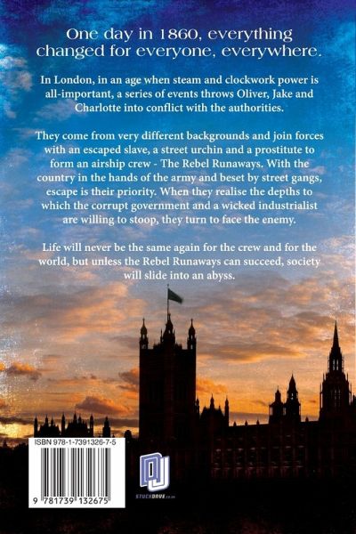 One day in 1860, everything changed for everyone, everywhere. In Victorian London, in an age when steam and clockwork power is all-important, a series of events throws Oliver, Jake and Charlotte into conflict with the authorities. They come from very different backgrounds and join forces with an escaped slave, a street urchin and a prostitute to form an airship crew - The Rebel Runaways. With the country in the hands of the army and beset by street gangs, escape is their priority. When they realise the depths to which the corrupt government and a wicked industrialist are willing to stoop, they turn to face the enemy. Life will never be the same again for the crew and for the world, but unless the Rebel Runaways can succeed, society will slide into an abyss. Freedom Skies is the first book in "The Rebel Runaways" series. The series features adventure stories that blend fiction with actual places, creating an alternative history and spotlighting the period when Steampunk began. If you enjoy books like 'The Aeronaut's Windlass' by Jim Butcher, 'Perdido Street Station' by China Miéville or the 'Magnificent Devices' series by Shelley Adina, you will love this story.