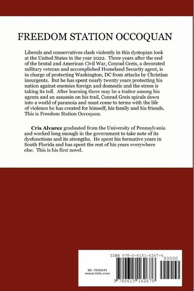 Liberals and conservatives clash violently in this dystopian look at the United States in the year 2022. Three years after the end of the brutal 2nd American Civil War, Conrad Greis, a decorated military veteran and accomplished Homeland Security agent, is in charge of protecting Washington, DC from attacks by Christian insurgents. But he has spent nearly twenty years protecting his nation against enemies foreign and domestic and the stress is taking its toll. After learning there may be a traitor among his agents and an assassin on his trail, Conrad Greis spirals down into a world of paranoia and must come to terms with the life of violence he has created for himself, his family and his friends. This is Freedom Station Occoquan.