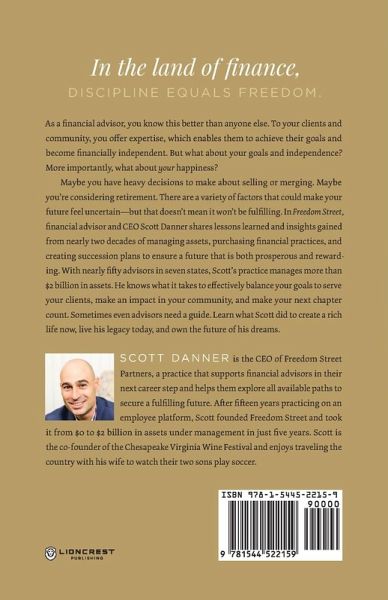 In the land of finance, discipline equals freedom. As a financial advisor, you know this better than anyone else. To your clients and community, you offer expertise, which enables them to achieve their goals and become financially independent. But what about your goals and independence? More importantly, what about your happiness? ¿ Maybe you have heavy decisions to make about selling or merging. Maybe you're considering retirement. There are a variety of factors that could make your future feel uncertain-but that doesn't mean it won't be fulfilling. In Freedom Street, financial advisor and CEO Scott Danner shares lessons learned and insights gained from nearly two decades of managing assets, purchasing financial practices, and creating succession plans to ensure a future that is both prosperous and rewarding. With nearly fifty advisors in seven states, Scott's practice manages more than $2 billion in assets. He knows what it takes to effectively balance your goals to serve your clients, make an impact in your community, and make your next chapter count. Sometimes even advisors need a guide. Learn what Scott did to create a rich life now, live his legacy today, and own the future of his dreams.