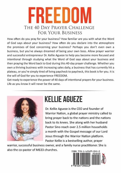 How often do you pray for your business? How familiar are you with what the Word of God says about your business? How often do you declare into the atmosphere the promises of God concerning your business? Perhaps you don't even own a business, but you've always dreamed of being your own boss. Allow prayer warrior and successful entrepreneur Dr. Kellie Agueze to help you become more focused and intentional through studying what the Word of God says about your business and then praying the Word back to God during this 40-day prayer challenge. Whether you own a thriving business with increasing sales daily, a business that has currently hit a plateau, or you're simply tired of living paycheck to paycheck, this book is for you. It is the will of God for you to experience FREEDOM. Get ready to experience the power of 40 days of intentional prayers for your business. Life as you know it will never be the same. Dr. Kellie Agueze is the CEO and founder of Warrior Nation, a global prayer ministry called to bring prayer back to the nations and the nations back to its knees. She along with her husband Pastor Sino reach over 2.5 million households a month with the Gospel message of our Lord Jesus through the Warrior Nation platform. Pastor Kellie is an author, prayer warrior, successful business owner, and a family nurse practitioner. She is also the co-pastor of M633 churches.