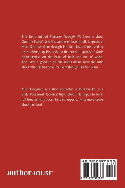 This book entitled Freedom Through His Cross is about God the Father's and His son Jesus' love for all. It speaks of what God has done through His Son Jesus Christ and by Jesus offering up His body on the cross. It speaks of God's righteousness on the basis of faith and not of works. The Lord is good to all and wants all to know the truth about what He has done for them through His Son Jesus.